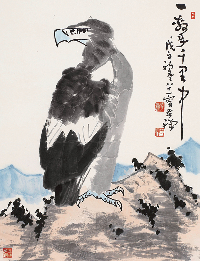 Li Kuchan fut professeur d’art à Pékin à partir de 1926, notamment à l’Académie centrale des Beaux-Arts de 1950 jusqu’à sa mort en 1983. Il se spécialisa dans la peinture d’oiseaux et de fleurs dans le xieyi libre et spontané qui capte l’esprit des sujets à travers un pinceau calligraphique expressif et des formes simplifiées. Il était connu pour sa représentation des oiseaux de proie tout au long de sa carrière, mais les œuvres de ses dernières années sont particulièrement libres et audacieuses.
