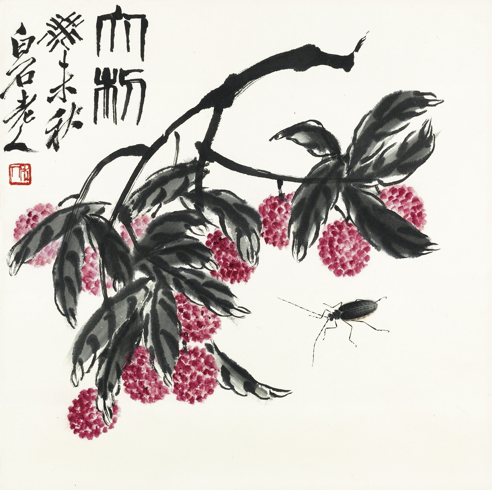 S’inspirant de la nature et des maîtres anciens, Qi Baishi a insufflé à ses oeuvres une odeur de terroir, un souffle de vie, et a combiné l’art populaire et l’art traditionnel, le croquis et la description suggestive, le style méticuleux et le style expressif.