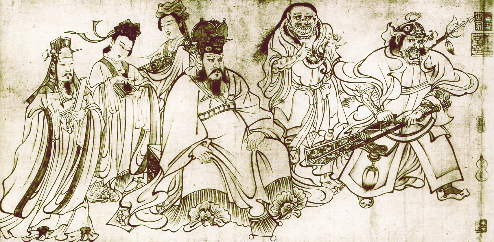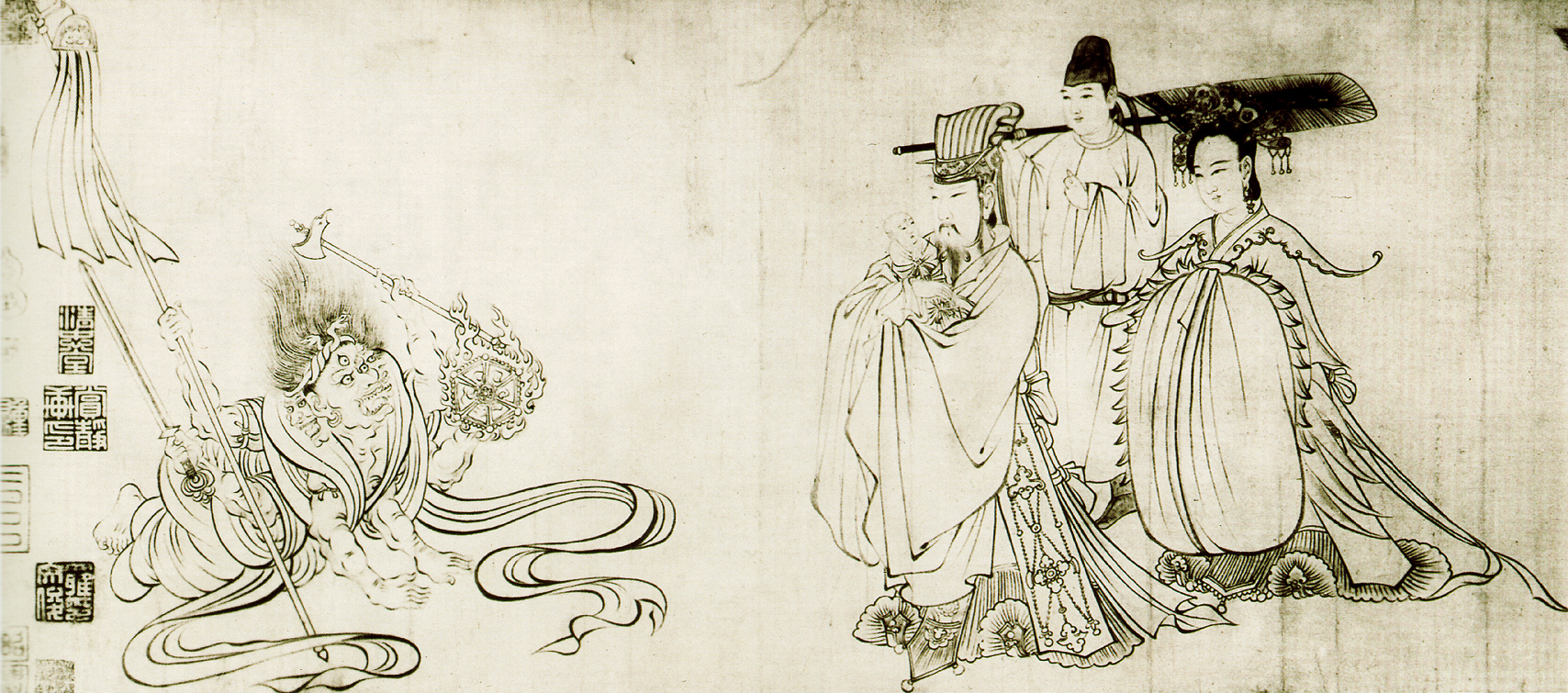 Wu Daozi originaire de Yangdi, province du Henan, était un peintre de la dynastie Tang chinoise (618-907) qui fut tellement encensé par les critiques plus tard que ses contributions sont presque enterré dans le mythe. Wu Daozi est considéré comme ayant peint une grande variété de sujets, peignant peut-être plus que toute autre chose de grandes compositions murales de personnages essentiellement bouddhistes.Wu daozi est surtout connu pour son imagination et la vigueur expressive de son pinceau – qui est même cité par les critiques Tang qui lui ont prodigué une note «divine» (shen). Son pinceau créait probablement des lignes expressives vives de tensions alternativement épaisses et minces – vus alors et rappelés encore en contraste distinct avec les délimitations plus précieusement colorées et uniformément contrôlées du style courtois contemporain.